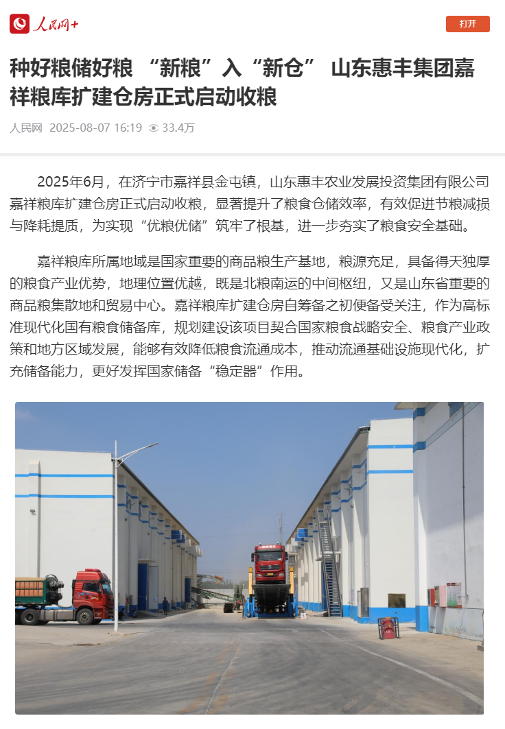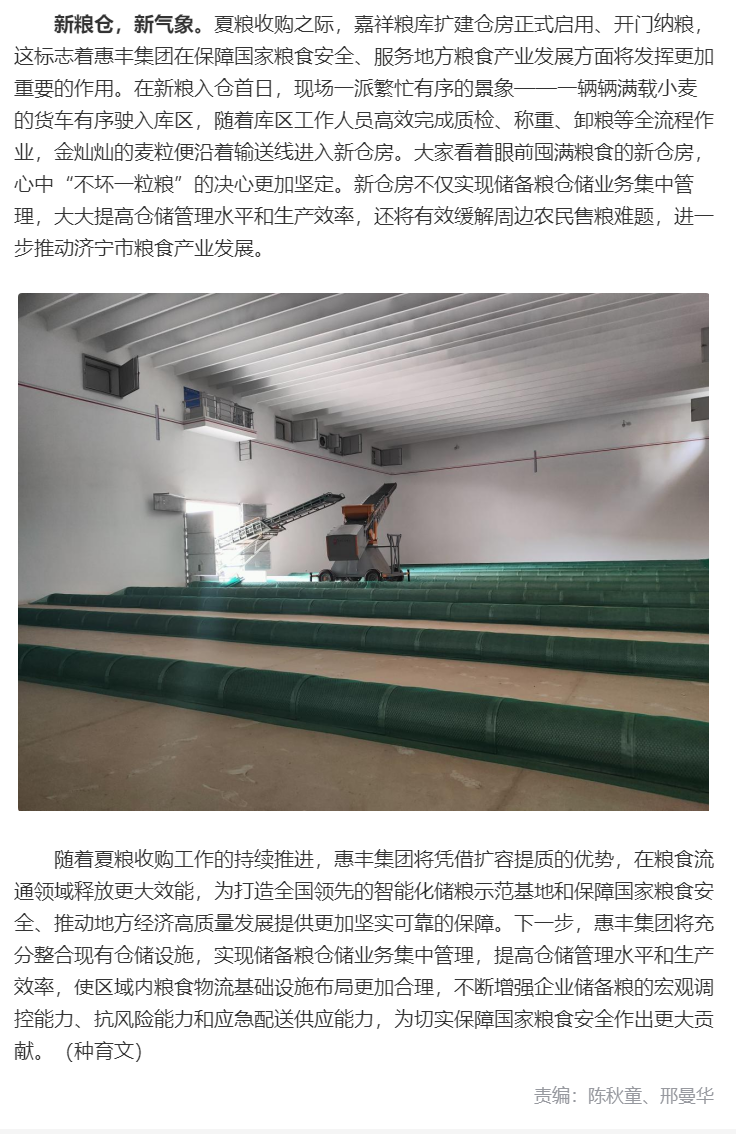 原鏈接:種好糧儲好糧 “新糧”入“新倉” 山東惠豐集團嘉祥糧庫擴建倉房正式啟動收糧
